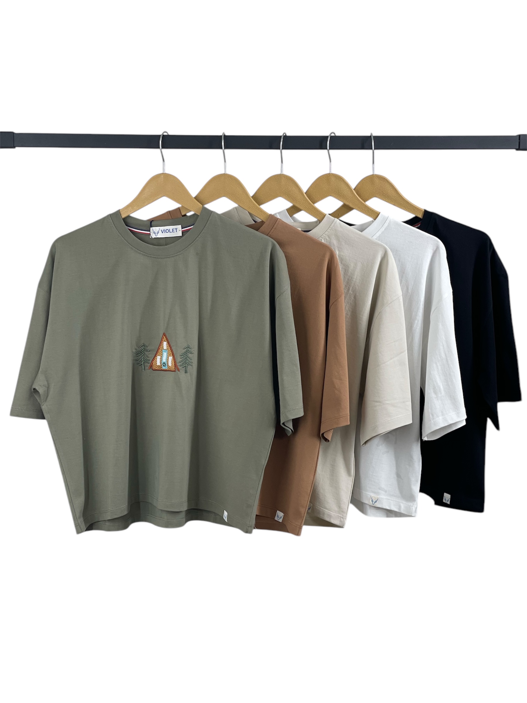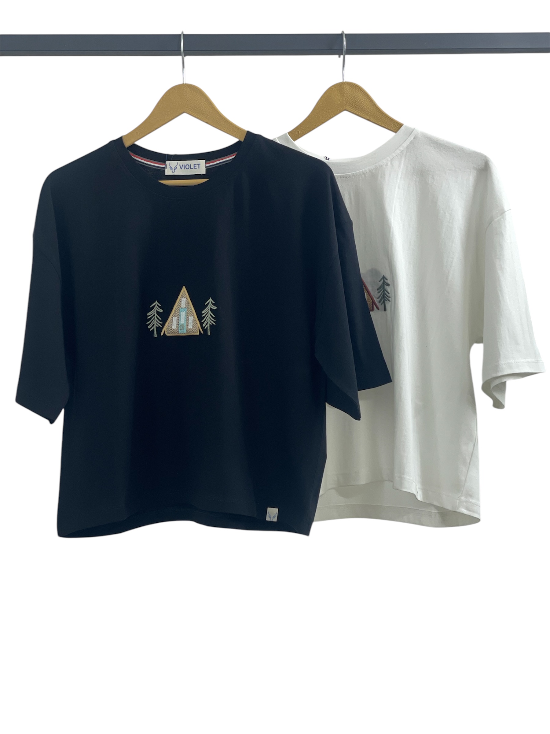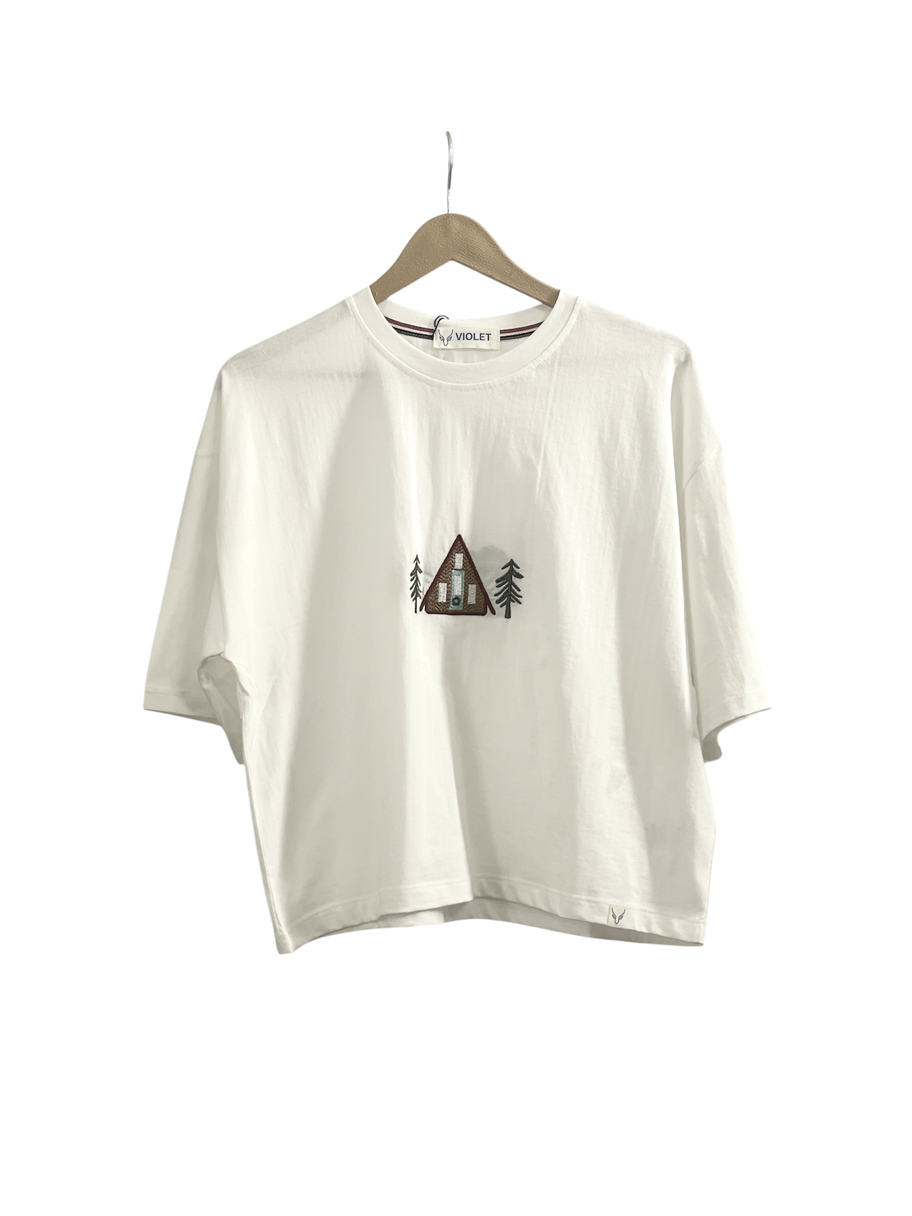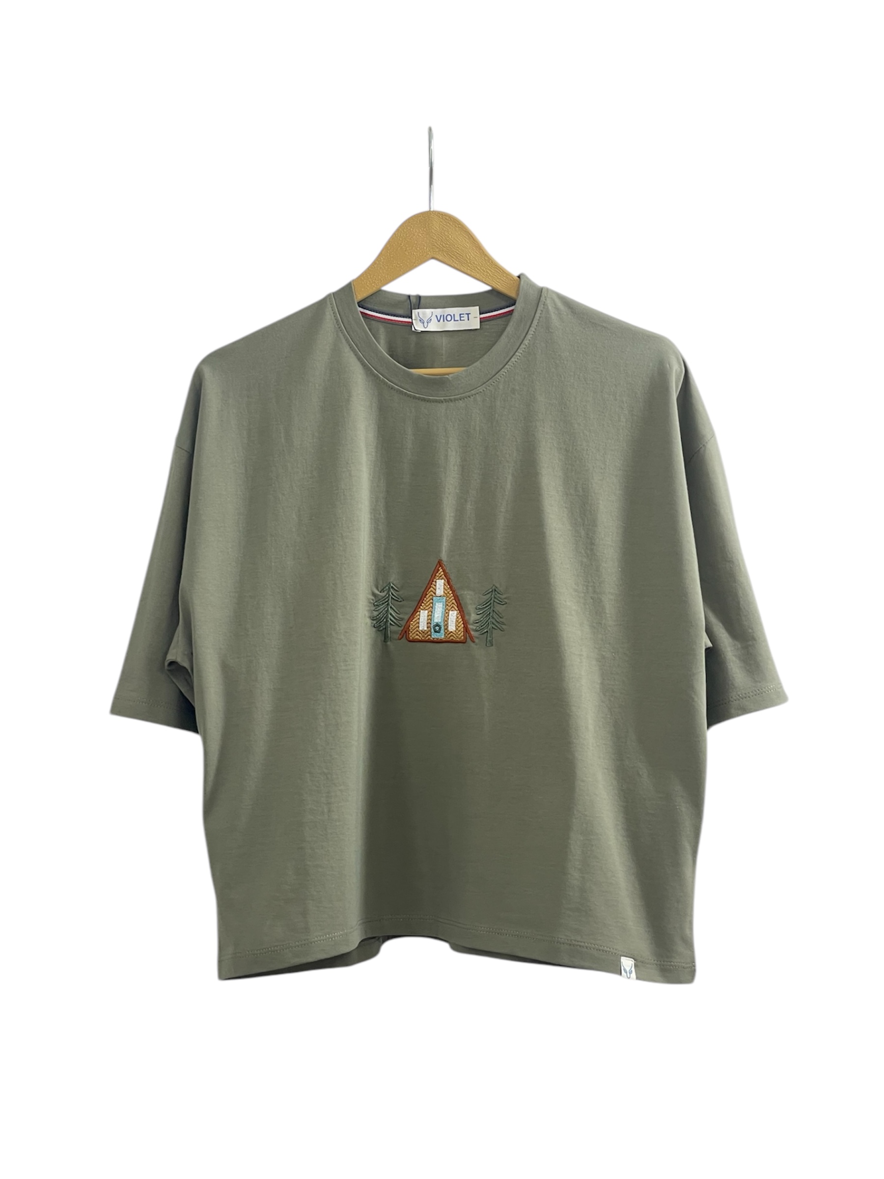 تیشرت کراپ گلدوزی طرح خونه جنس نخ پنبه در ۵ رنگ سبز نسکافه ای،سفیو،کرم،مشکی