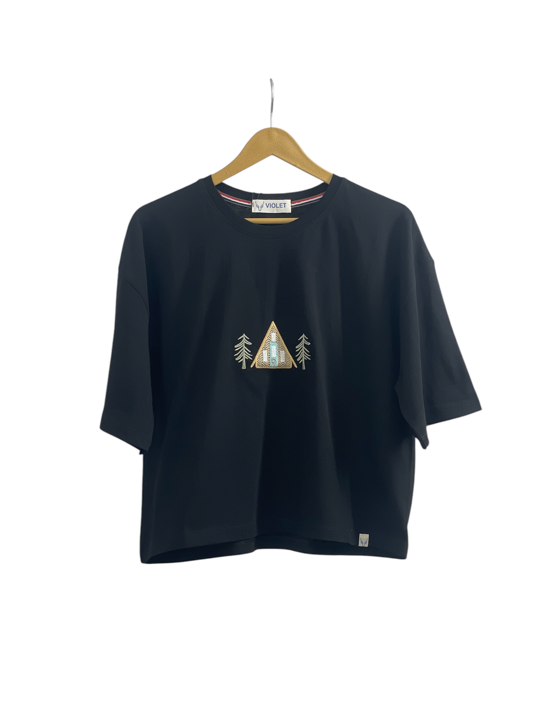 تیشرت کراپ با طرح گلدوزی خونه در ۵ رنگ متنوع فری سایز مناسب تا سایز ۴۴