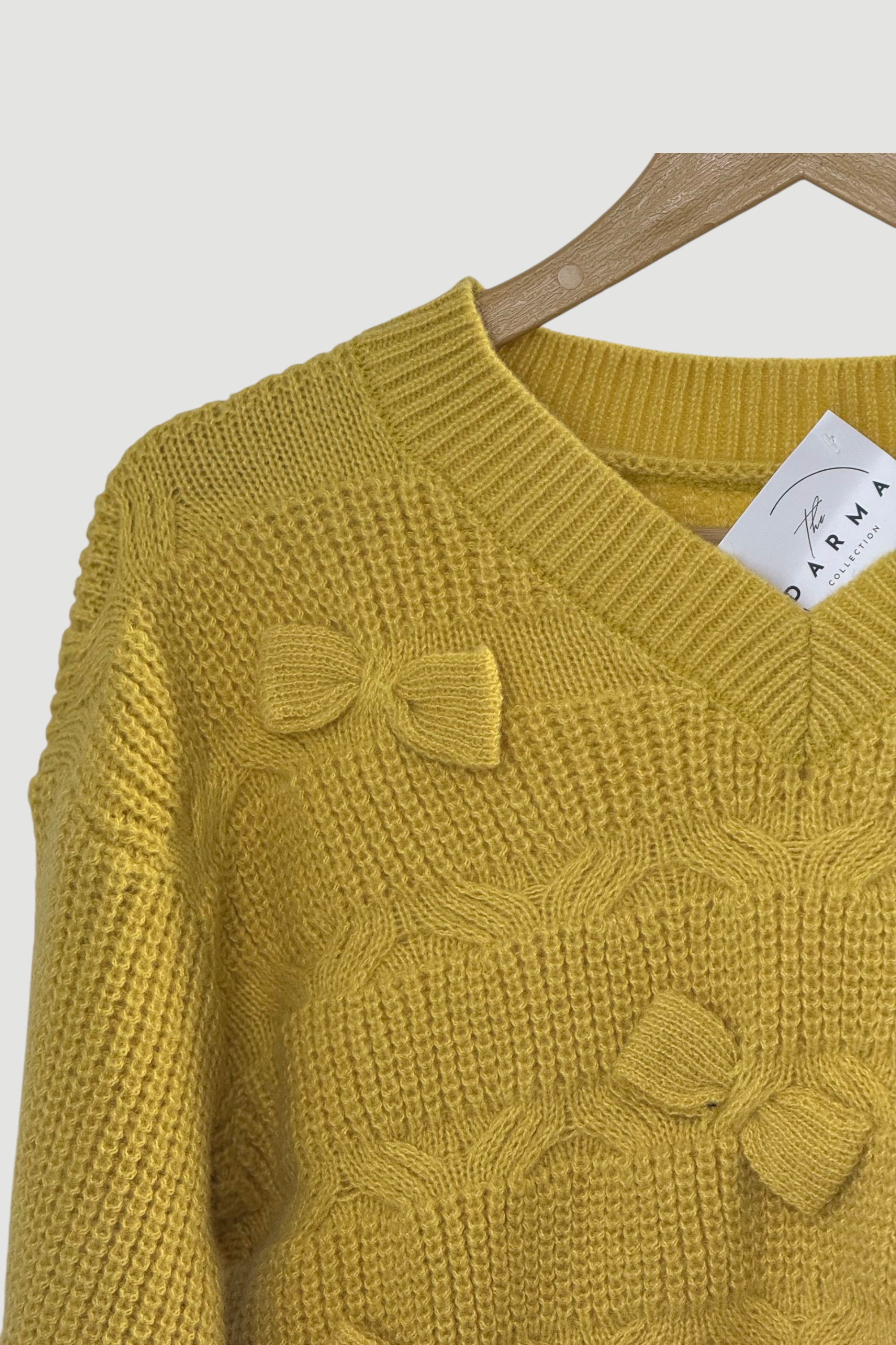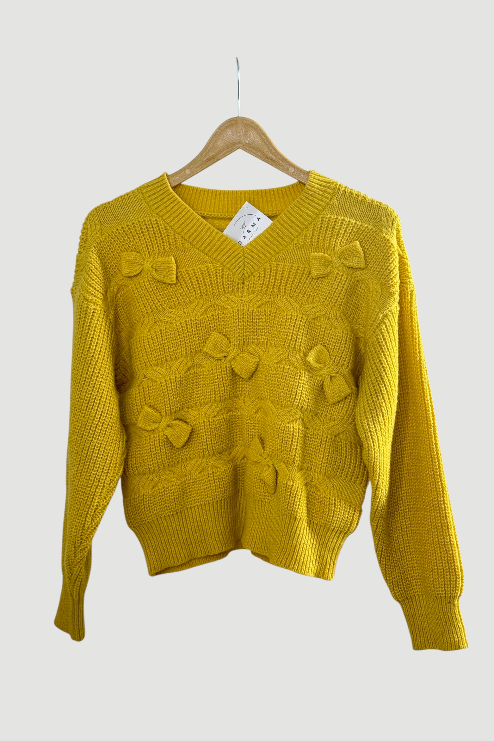 بافت زنانه پاپیونی در رنگ جذاب خردلی، از جنس کاموای نرم و لطیف، مناسب برای فصل پاییز و زمستان. طراحی خاص با گرههای پاپیونی روی بافت، استایل دخترانه و خاصی ایجاد کرده است. مدل یقه V و فرم آزاد (Free Size) باعث میشود برای اکثر سایزها مناسب باشد و به راحتی با شلوار جین یا دامن ست شود. این بافت هم برای استایل روزمره و هم استایل بیرونی گزینهای شیک و متفاوت است.