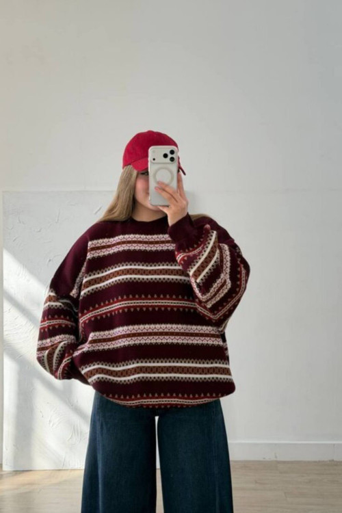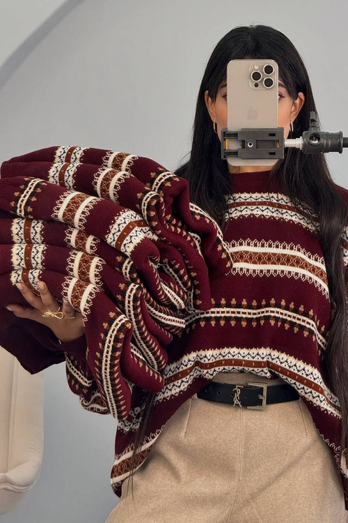 این یک بلوز بافت Free Size زنانه با یقه گرد و فیت آزاد است که روی بدن حالت لانگ و راحت دارد و برای سایزهای مختلف مناسب است. بافت آن از جنس نخ نرم و لطیف است که روی پوست نمیخارَد، آستینها کمی افتاده و بلند طراحی شدهاند و لبهی یقه، مچ و پایین بلوز کشبافت است تا بهتر روی بدن بنشیند. رنگ اصلی لباس زرشکی است و طرحهای راهراه و قلبی/ژاکارد به سبک Fair Isle در آن به کار رفته که ترکیبی شیک و زمستانی میسازد و برای استایلهای روزمره، دانشگاه و دورهمیهای دوستانه با شلوار پارچهای، جین یا دامن قابل ست کردن است