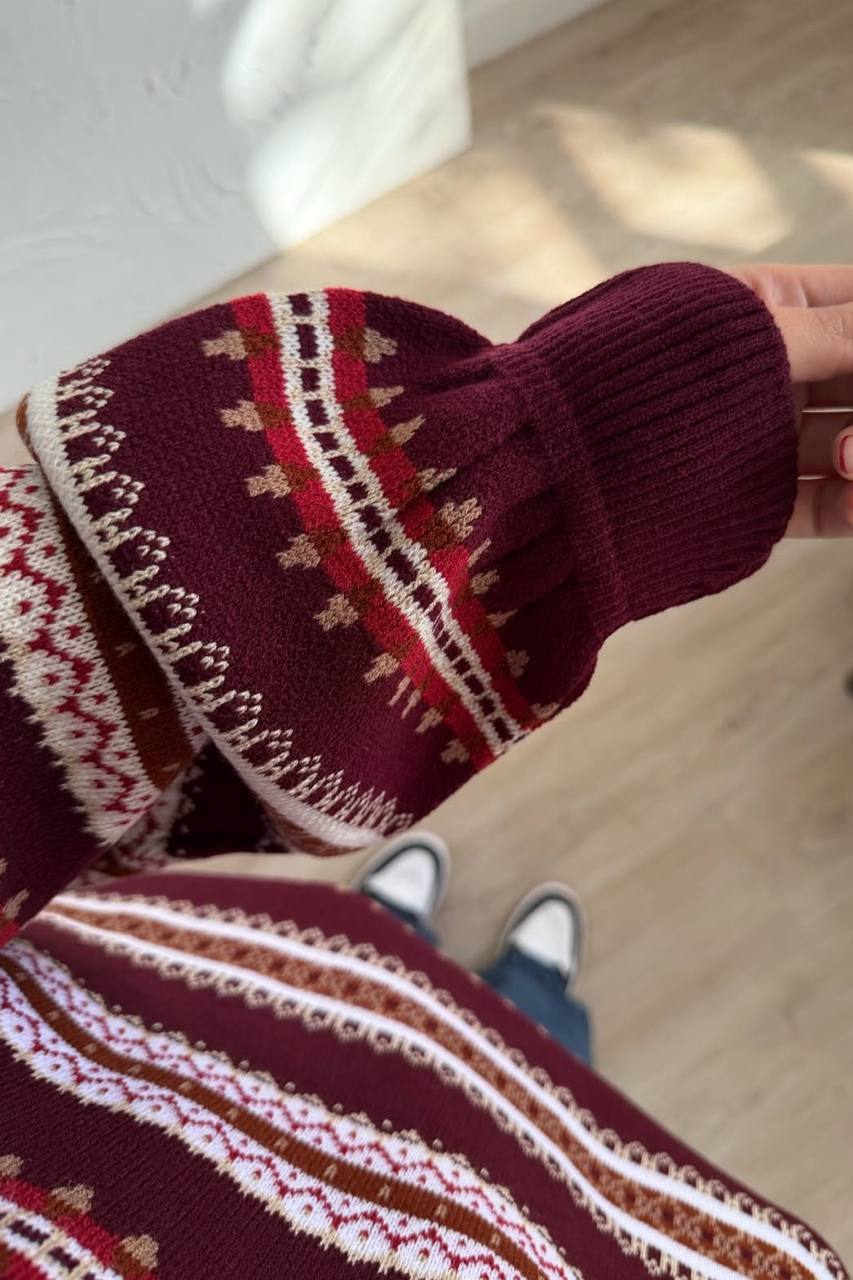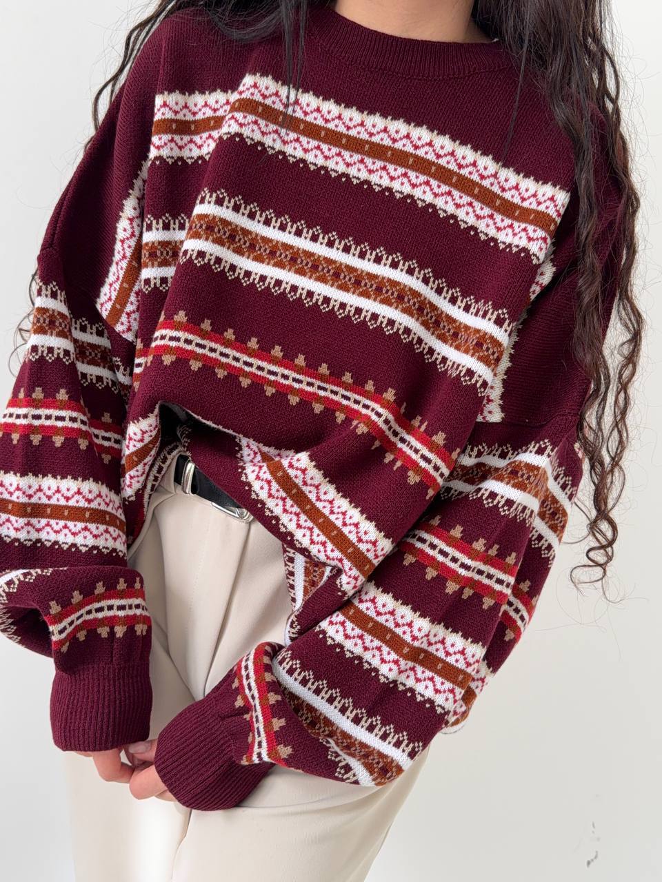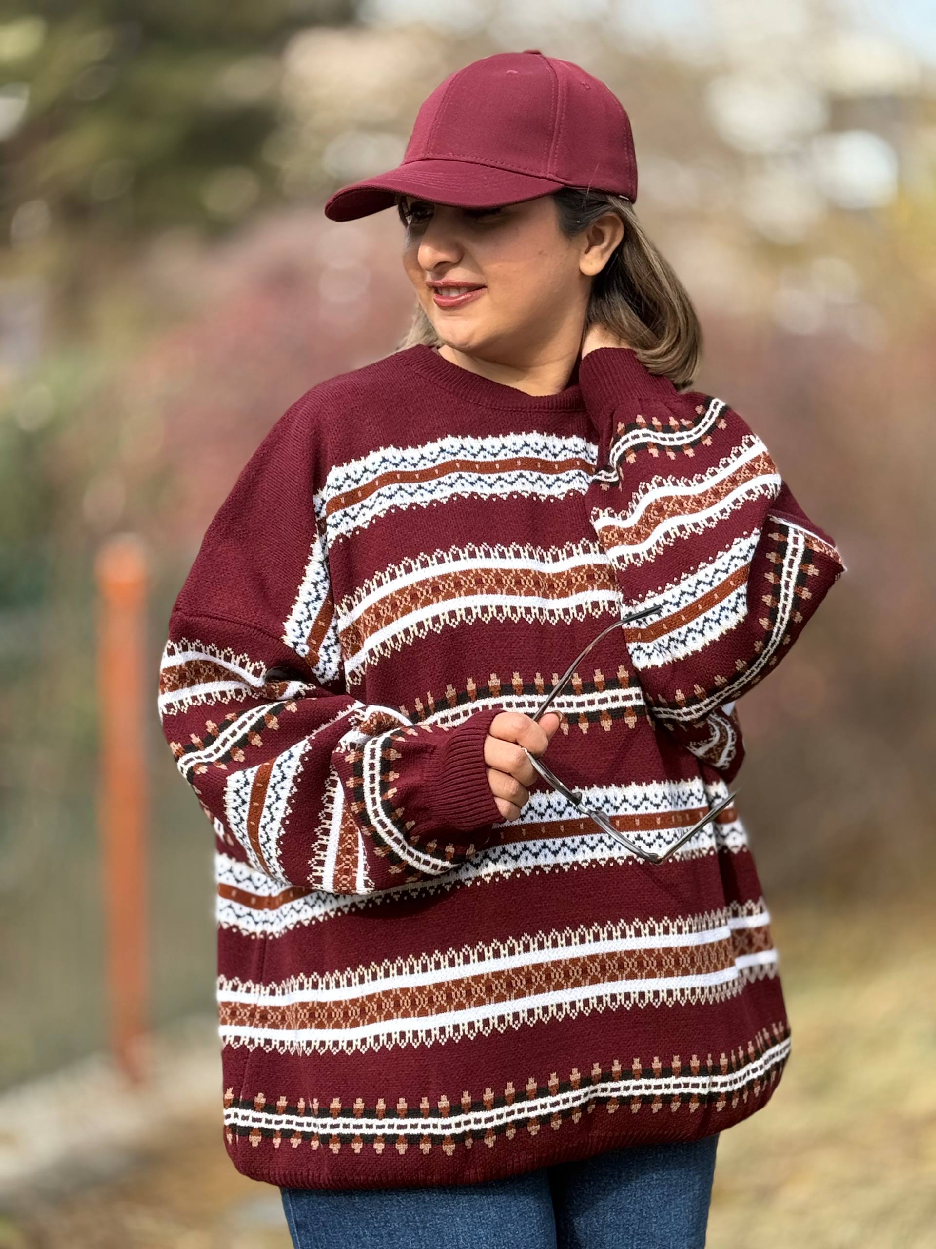 این یک بلوز بافت Free Size زنانه با یقه گرد و فیت آزاد است که روی بدن حالت لانگ و راحت دارد و برای سایزهای مختلف مناسب است. بافت آن از جنس نخ نرم و لطیف است که روی پوست نمیخارَد، آستینها کمی افتاده و بلند طراحی شدهاند و لبهی یقه، مچ و پایین بلوز کشبافت است تا بهتر روی بدن بنشیند. رنگ اصلی لباس زرشکی است و طرحهای راهراه و قلبی/ژاکارد به سبک Fair Isle در آن به کار رفته که ترکیبی شیک و زمستانی میسازد و برای استایلهای روزمره، دانشگاه و دورهمیهای دوستانه با شلوار پارچهای، جین یا دامن قابل ست کردن است